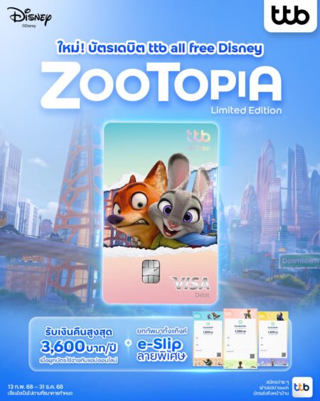 ทีเอ็มบีธนชาต หรือ ทีทีบี เปิดตัวบัตรเดบิต ทีทีบี ออลล์ฟรี ดิสนีย์ ลายใหม่ “Zootopia Limited Edition” ครั้งแรกในไทย เพื่อต้อนรับกระแสภาพยนตร์ Zootopia 2 ที่กำลังเป็นที่จับตาของสาวกดิสนีย์และแฟนทั่วโลก นำสองตัวละครเด่นอย่าง จูดี้ ฮอปส์ และ นิค ไวลด์ มาถ่ายทอดบนดีไซน์หน้าบัตรแบบลิมิเต็ด อิดิชัน พร้อมด้วย e-Slip 3 แบบพิเศษให้ทุกการทำธุรกรรมมีเอกลักษณ์มากขึ้น