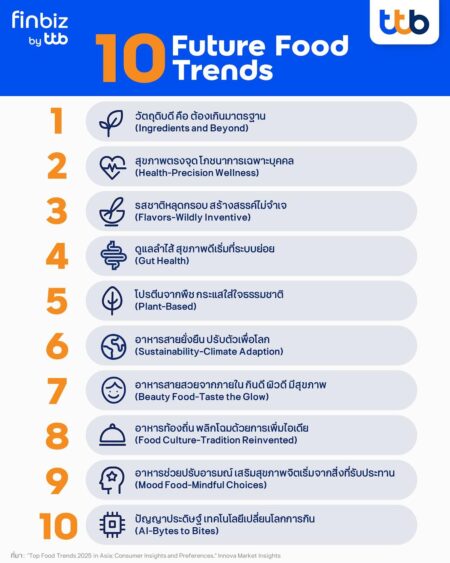 โลกของอาหารกำลังเข้าสู่ยุคเปลี่ยนผ่านครั้งใหญ่ ไม่ใช่แค่ความอร่อย หรือ แพ็กเกจที่สวยงามอีกต่อไป แต่ผู้บริโภคทั่วโลกมองลึกถึง “วัตถุดิบ สุขภาพ ความยั่งยืน และนวัตกรรม” และเทรนด์ที่น่าสนใจนี้ เรียกว่า “Future Food” ซึ่งจะมาสร้างโอกาสทองให้ธุรกิจไทย โดยเฉพาะผู้ประกอบการอาหาร เครื่องดื่ม และสินค้าเพื่อสุขภาพ finbiz by ttb จึงจะพาไปเจาะเทรนด์อาหารแห่งอนาคต ที่จะเป็นโอกาสใหม่ของธุรกิจไทย