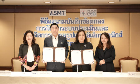 บริษัท เอเอสเอ็ม เทรนนิ่ง จำกัด (ASMT) ประกาศความร่วมมือเชิงยุทธศาสตร์ร่วมกับ ศูนย์จิตวิทยาเพื่อประสิทธิภาพองค์กร คณะจิตวิทยา จุฬาลงกรณ์มหาวิทยาลัย (PSYCH CEO) ลงนามบันทึกข้อตกลงความร่วมมือ การจัดทำระบบประเมินและการจัดการอบรมสำหรับองค์กรในรูปแบบอิเล็กทรอนิกส์ มุ่งผสานองค์ความรู้ทางจิตวิทยาเข้ากับเทคโนโลยีดิจิทัล” ผ่านแพลตฟอร์ม SCREENEO เพื่อยกระดับศักยภาพบุคลากรไทยให้สอดรับองค์กรยุคใหม่ ภายในงานได้รับเกียรติจาก ธงชัย ล่ำซำ ประธานกรรมการ เฉลิมโชค ล่ำซำ กรรมการผู้อำนวยการใหญ่ และ ดร.สมภพ เจริญกุล ที่ปรึกษาประธานกรรมการ บมจ.ล็อกซเล่ย์ ร่วมเป็นสักขีพยาน ณ ห้องประชุมชั้น 18 อาคารล็อกซเล่ย์