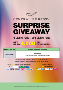 - ช้อปครบ 30,000 บาท/วัน รับฟรี Central Embassy Voucher มูลค่า 1,000 บาทสูงสุด 4,000 บาท/ท่าน (จำกัด 50 รางวัลต่อรอบ รวม 200 รางวัลตลอดรายการ)